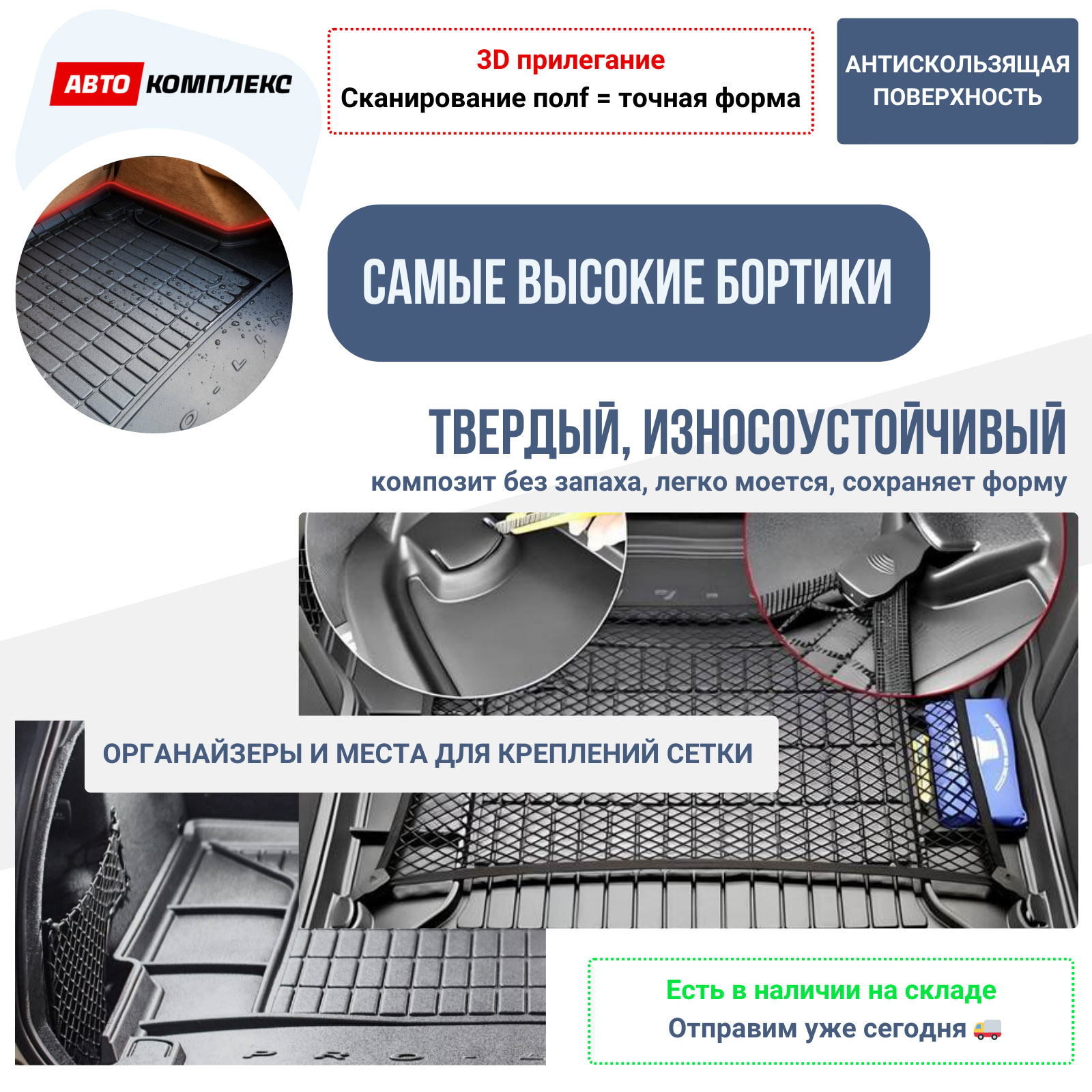 Коврик багажника имеет интегрированные органайзеры и специальные места для крепления сетки — всё продумано до мелочей. - Быстрая отправка